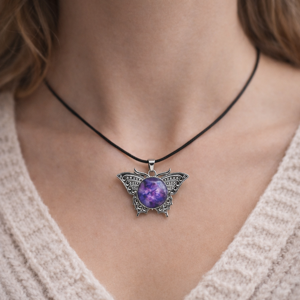 The soft purple tones in this butterfly pendant feel like a quiet hello from beyond — a reminder that love still surrounds you, even when you cannot see it.