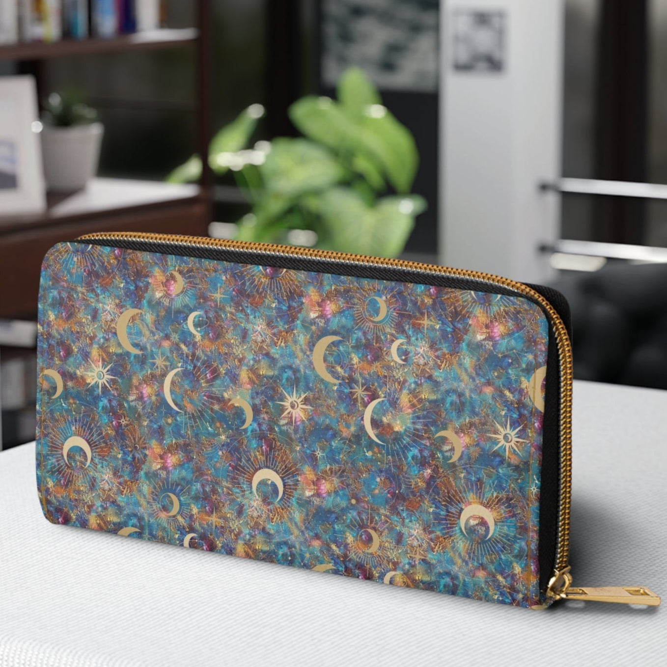 Celestial Pattern Zipper Wallet - Mystic Moon and Star Design