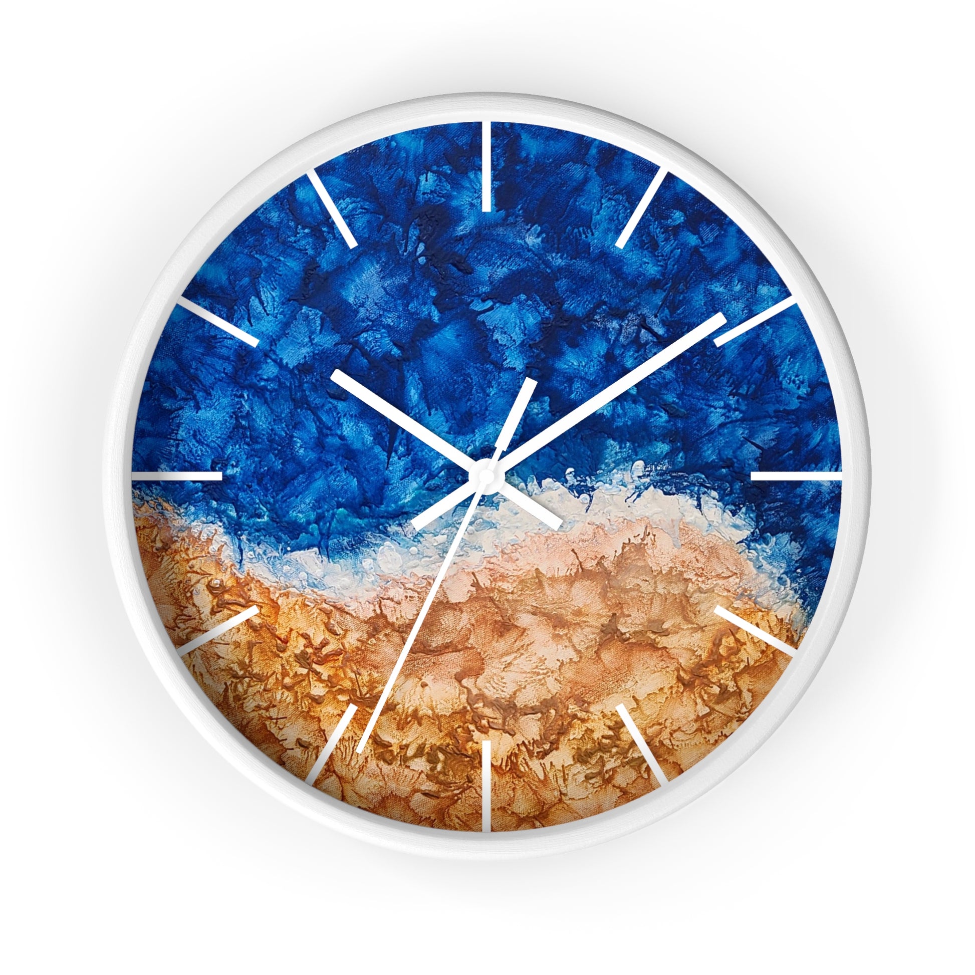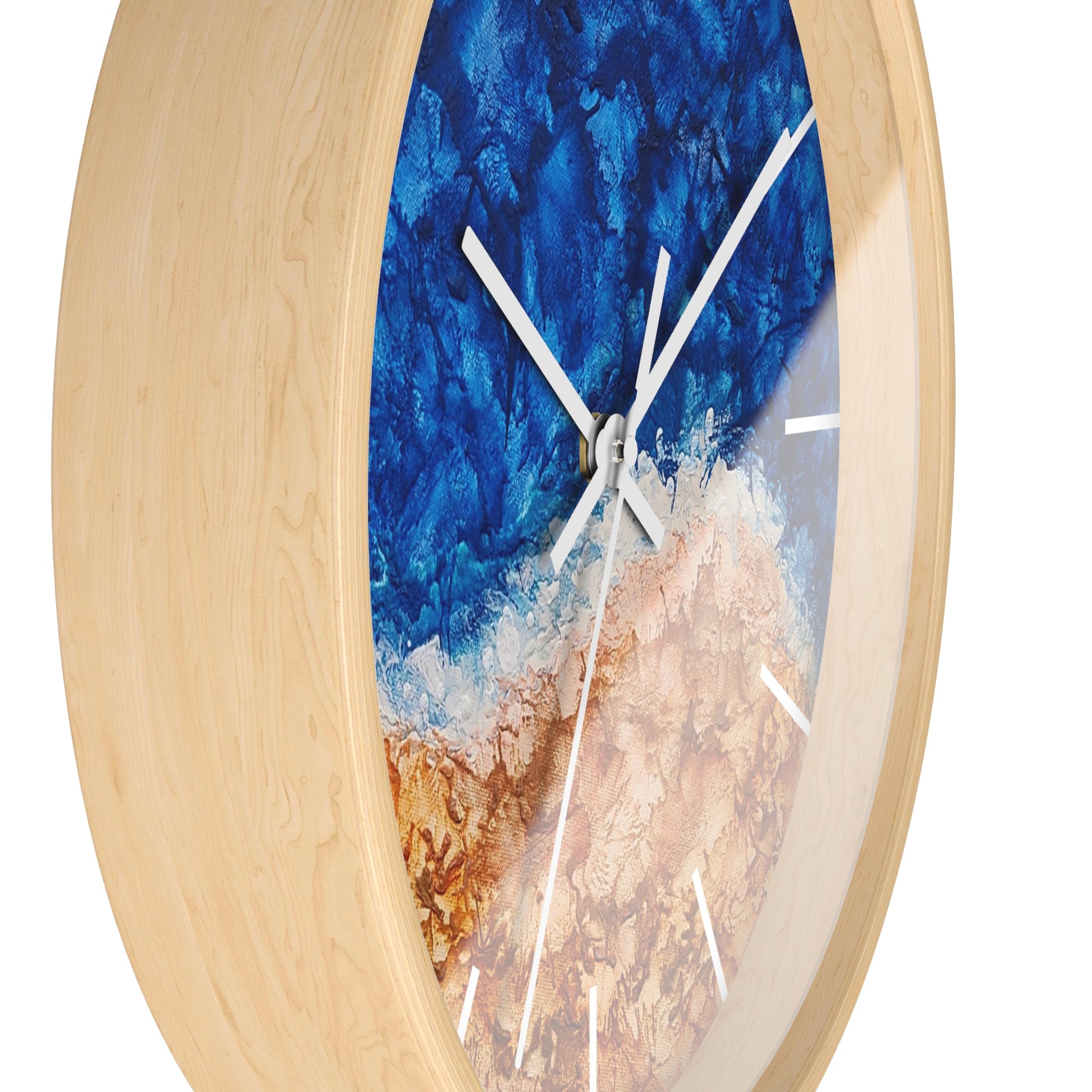 Imagine the hush of waves and the warmth of sunlit shores—this soothing wall clock carries that coastal calm into your everyday. Featuring my original Along the Coast encaustic artwork, it’s more than a timepiece; it’s a gentle pause, a breath of ocean air every time you glance its way.